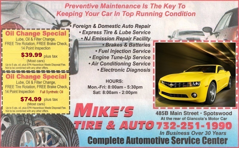 Please Present Coupon (Print or Show on Your Cell Phone) Mike's Tire and Auto Repairs: Auto Repair in Spotswood Tel: 732-251-1990 485B Main Street, Spotswood, NJ 08884 Entry Door and Key Drop are on George Street.